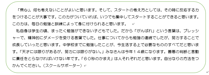 今回の活動をするにあたり保護者の方やスクールサポーターの方、先生に「かまえの60秒」について、学級委員長がインタビューしたり、アンケートを行ったりしました。その内容を下に載せています。ご協力ありがとうございました。