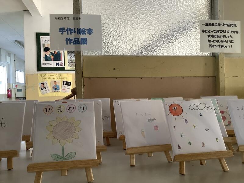 家庭科で制作した絵本を展示しています。それぞれおもしろい内容のものができあがっています。各学級1週間ずつ展示します。