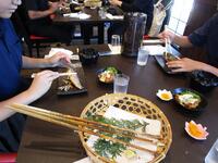 学習の後半では、実際に食文化を体験しました。伝統のアユ料理や、延岡発祥のチキン南蛮を味わうことで、郷土の味に親しみながら文化を体感することができました。アユ料理では、伝統的な魚の骨の取り方を実演を交えて指導してくれましたが、なかなか難しく、生徒たちは愛苦戦苦闘していました。