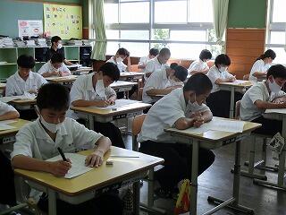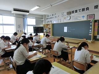 全学年とも真剣な取組がみられました。特に3年生の最近の取組は、多くの生徒が職員に質問にきたり、登校中にも友達と問題を出し合うなど、他学年よりも熱心にこのテストに取り組む姿が見られました。テストも明日までです。テスト時間いっぱい粘って行きましょう。