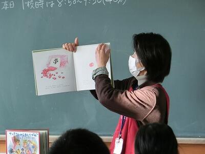 ボランティア「くす楠」の皆さん方から、朝の時間に読み語りをしていただきました。今日は、1年生の4クラスです。