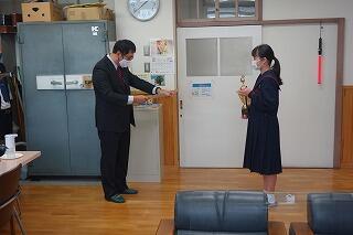 【 ↓ 感謝状を受け取ったのは、前期美化委員長の佐保里彩さんです】