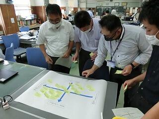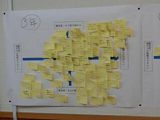 岡富中の生徒だったら、「こんな生徒であってほしい」というテーマで、職員研修を実施しました。学校の教育目標である「気力」「体力」「学力」「協力」を踏まえながら、先生方の想いを付箋紙に書き、学年毎に模造紙に貼っていきました。