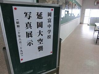 岡富中学校の玄関フロアーには、夕刊デイリー新聞社から借りてきた「延岡大空襲」の写真を展示しています。