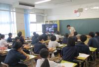 今年度の平和学習は、夕刊デイリー新聞社社長を講師としてお迎えし、全校生徒を対象に講話を行いました。講師の先生からは、戦時中に実際に起きた大空襲の様子や、町が焼け野原となった当時の様子について、貴重な写真や映像を交えてお話しいただきました。普段の平和な日常からは知ることが難しい、戦争の悲惨さや苦しみを感じ取ることができ、生徒たちは真剣な表情で話に耳を傾けていました。戦争の恐ろしさとともに、日々の平和のありがたさを改めて心に刻む学びとなりました。当日は急激な暑さの変化があったため、生徒の健康面を考慮し、急きょ校長室から各教室へオンライン配信する形式を取りましたが、全員が各教室で集中して参加することができました。