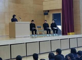 始業式では生徒発表があり、1,2,3年生と生徒会から各代表4名が発表しました。