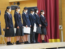 各表彰を最初に行い、終業式の最初に、各学年及び生徒会代表の4名の生徒から2学期の反省について発表してもらいました。その後、校長先生から話しをしていただきました。