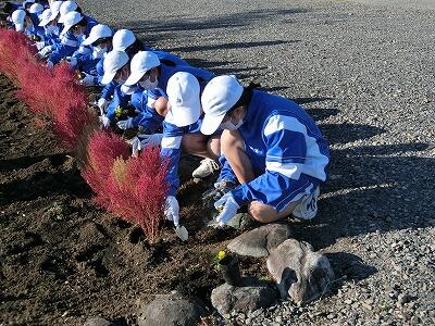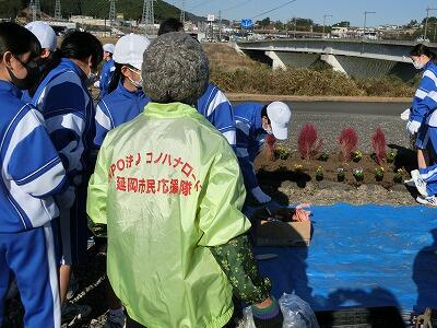 五ヶ瀬川堤防沿いに、パンジーとビオラの苗を植えました。この活動は、岡富中学校の1年生が長年実施している活動です。NPO法人コノハナロード延岡市民応援隊の方々と一緒に作業しました。