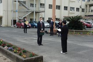 本日は、1年生が取り組んできた人権の花活動に対しての感謝状の贈呈式が