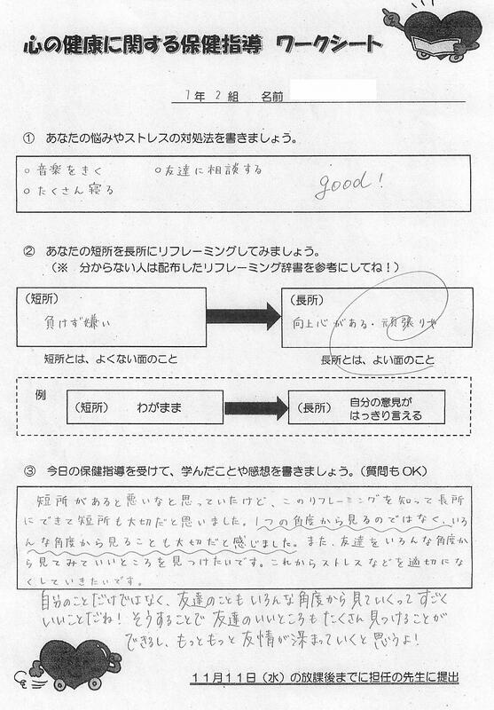 保健指導後には、生徒の書いたワークシートに、「自分の良さに気づいて、自分をもっと好きになってほしい…」と、先生が一人一人丁寧にコメントを記入し、返信しました。