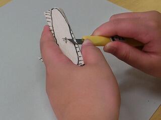 多くの先生方に授業を見ていただきました。生徒たちは、真剣に、カッターナイフで作業していました。カッターナイフで鉛筆を削ったことがない生徒も3分の1いましたが、先生の話を聞きながら安全に作業できました。どんなルアーが完成できるでしょうか。