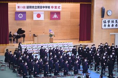 令和3年度 第73回 卒業式を実施しました。コロナ感染症対策のため、1・2年生は、教室でZOOMによる視聴になりました。卒業証書を受け取る先輩方を見ながら、あんな先輩になりたいと誰もが感じたことだともいます。卒業式の歌もマスク越しではありましたが、素晴らしいハーモニーを響かせ、保護者からも拍手を頂きました。1・2年生徒抜きの卒業式にはないましたが、素晴らしい式になりました。