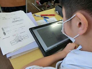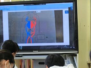 本日の授業内容は、「生命を維持するはたらき」でした。学習課題は、心臓を出た血液は、どのような経路を経て、細胞でどんなはたらきをして、再び心臓に戻ってくるだろうか、です。学んだことをタブレットにまとめ、画面を共有して、発表をするというものです。