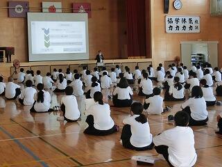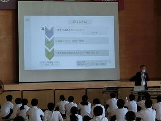1年生は、体育館で講師を招き、SDGsから世界を考える「環境と貧困」という内容でお話しを聞きました。講師は、延岡市教育委員会キャリア教育センターの富山先生です。
