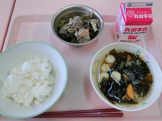 【今日のメニュー(ごはん・牛乳・夏野菜のみそ炒め・はんぺん汁)】