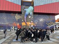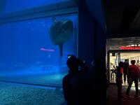 見慣れない建物に囲まれながら正面入口で集合写真を撮り、たくさんの種類の海の生き物たちを見学しました。