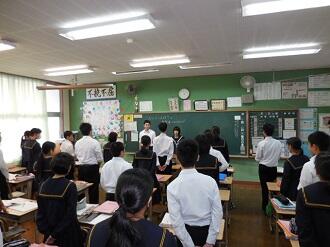 6月14日(木)に、黒岩中から全校生徒16名と、先生方が、1日合同学習に来校されました。この行事は、少人数の黒岩中から、これからの、高校生活や社会にでてのことを考えて、ぜひ大人数での中での授業や学校生活を体験したいとのことで、3年前から始まりました。3年生は、もう慣れているはずなのですが、いざやって来ると最初はちょっとお互い緊張しているようでした。しかし、朝の全校集会で、黒岩中の生徒のみなさんは、元気よく自己紹介ができてすばらしいと感じました。