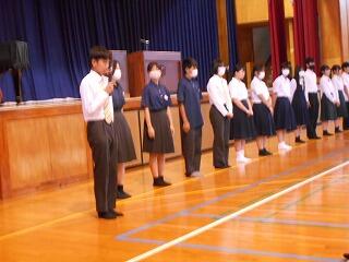 旧生徒会の各委員会副委員長、各委員会委員長、生徒会本部役員より全校生徒へこれまでの取組の感想や御礼などがのべられ、全校生徒の拍手をもって旧生徒会の皆さんへの労をねぎらいました。