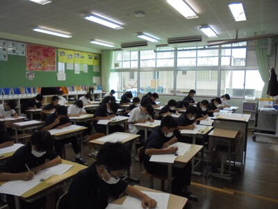 下の画像は1校時のテストの様子です。どの学年・クラスでも、真剣にテスト問題に取り組む生徒の姿がありました。