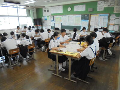 1年生は、来週実施する「一次産業体験学習」に向けて産業に関する事前学習が行われました。2年生は、1学期の後半に引き続き、修学旅行に向けての準備が行われました。3年生は、進路学習(10年後の世の中と私)について発表に向けた準備が行われました。