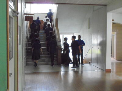 まず、各教室では、学級担任の先生から学校周辺のハザードパップや避難経路図を用いて、学校周辺のようすと有事の際の避難経路等について説明がありました。その後、避難指示の放送を受けて実際に避難行動を行いました。今回は”垂直避難”の動線等を実際に動いての確認でした。