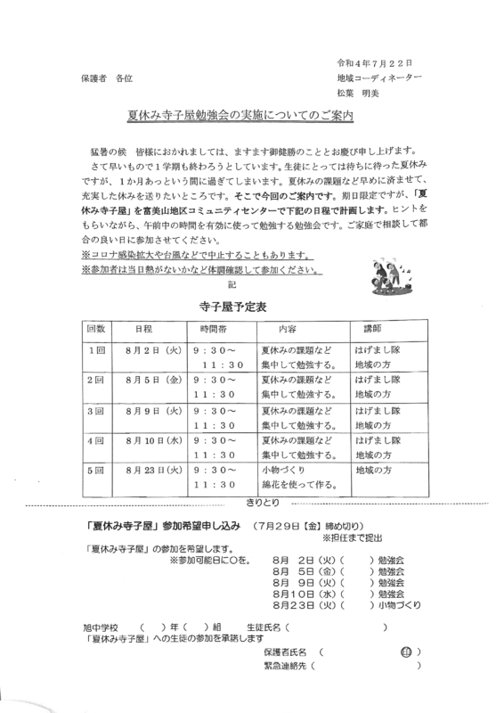本校の地域コーディネーター主催で1,2年生を対象にした夏休み寺子屋勉強会が開催されます。