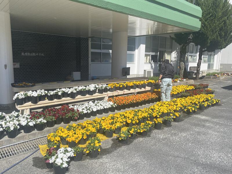 玄関前の花は、卒業式や入学式に合わせて調整しながら種から育てています。卒業式を明日に控えた今、満開です!