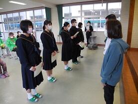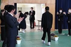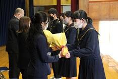 15日(月)3年生9名の英検表彰、3年生9名の皆勤賞表彰、最後に卒業式の歌を2曲、1・2年生に披露しました。卒業式に参列しない1・2年生に、聴いてもらうことができ、全校生徒で感動を味わうことができました。最後は、拍手で見送ることができました。