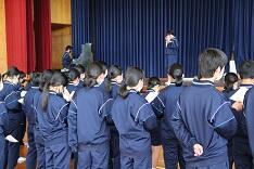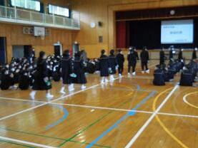 13日(火)、2校時に「生徒指導集会」を行いました。はじめに「服装容儀検査」を行い、全職員で一人一人の身だしなみについての指導がありました。待っている間、少し緊張した様子はありましたが、スムーズにできました。その後、生徒指導主事による「集団行動」の説明があり、冷静な行動が、災害時や緊急時に役立つことなど、集団行動の重要性についてふれました。