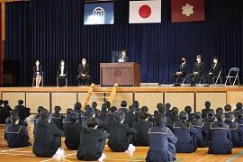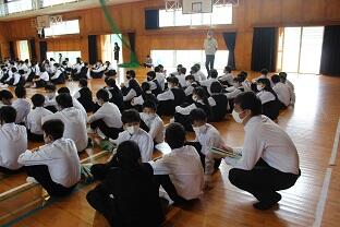 修了式では、修了証書授与、各学年生徒代表による反省と抱負、校長先生の話がありました。校長先生の話の中に、卒業式のときの答辞の一部分の紹介があり、生徒たちはその言葉をしっかりと受けとめているようすでした。