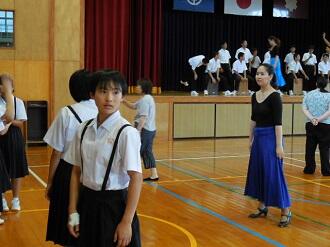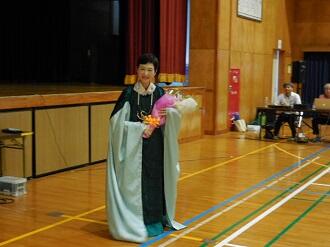 上演を終了され、舞台から降りて、生徒達にやさしく語りかける柴田美保子さん。