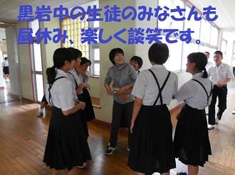 6月14日(木)に、黒岩中から全校生徒16名と、先生方が、1日合同学習に来校されました。この行事は、少人数の黒岩中から、これからの、高校生活や社会にでてのことを考えて、ぜひ大人数での中での授業や学校生活を体験したいとのことで、3年前から始まりました。3年生は、もう慣れているはずなのですが、いざやって来ると最初はちょっとお互い緊張しているようでした。しかし、朝の全校集会で、黒岩中の生徒のみなさんは、元気よく自己紹介ができてすばらしいと感じました。