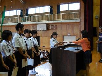 本日、全校集会で6月9日(土)から開催された、第69回延岡地区中学校総合体育大会の表彰が行われました。本校は、団体で男子バスケットボール部が準優勝し、県大会に出場。女子ソフトテニス部が団体3位となり、県大会に出場となりました。また、ソフトテニス個人で、(3年江夏・野添ペア)が9位入賞し、県大会出場となりました。また、社会体育として活動している硬式テニス競技、陸上競技、柔道競技も表彰され、それぞれ県大会でがんばることになりました。※水泳競技でも1名出場します。