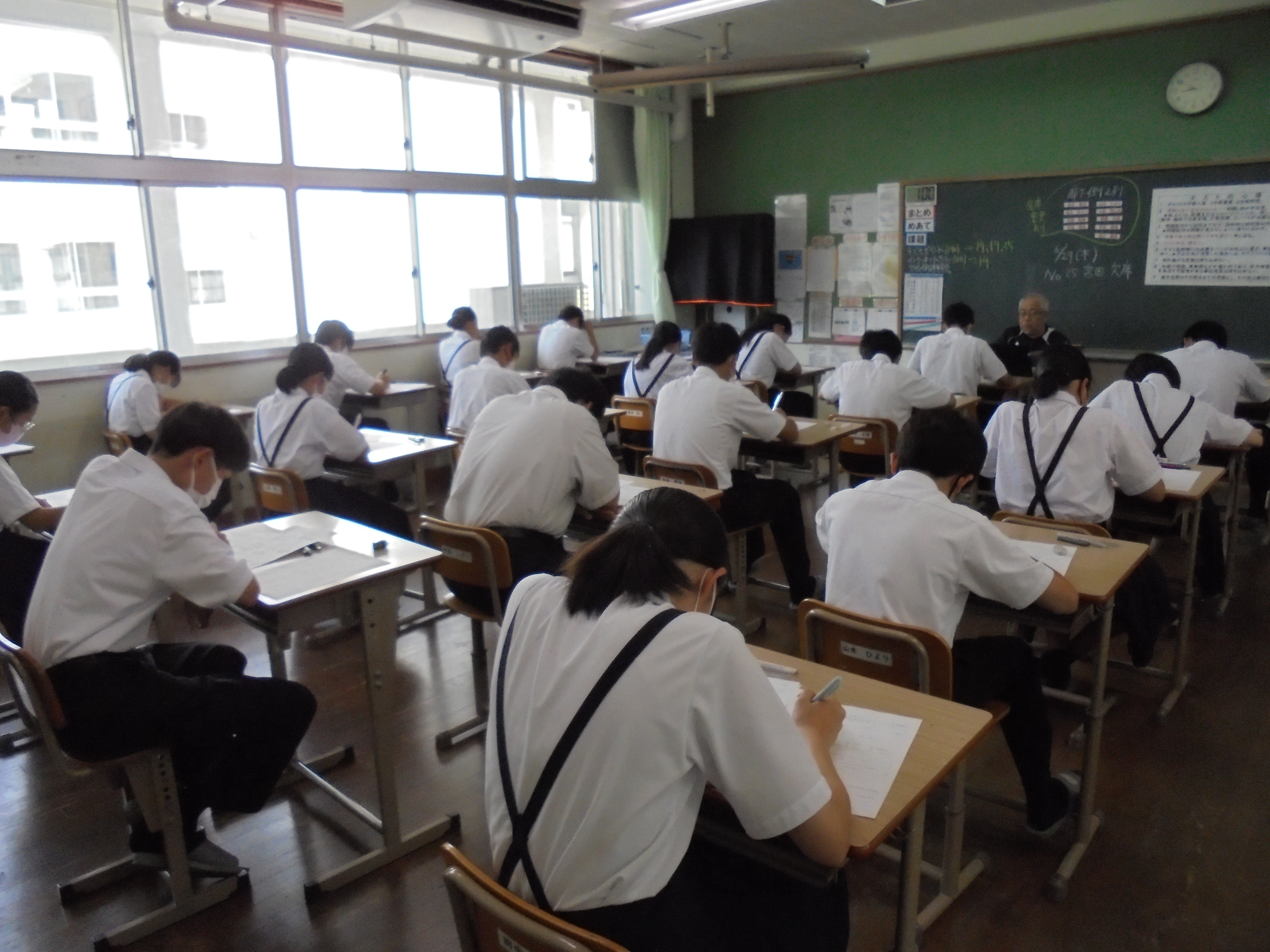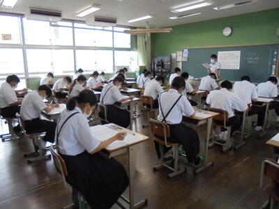 夏休みが明けて最初のテストです。夏休みの学習の成果を発揮すべく、すべての教室に真剣に問題用紙に取り組む生徒の姿がありました。特に3年生にとっては、進学に関わる貴重な機会となります。テストに臨む気持ちは、1・2年生とはまた違ったものがあることでしょう。