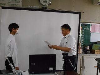 終業式の後は、県大会等の表彰が行われました。県大会の結果、体操競技で九州大会へ出場する生徒が抱負を述べました。「九州大会で上位に入り、全国大会を目指します」という力強い決意でした。