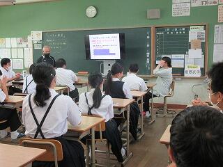 長友さんからは、延岡の食文化を通して観光の活性化を図ることなど、様々な話をしていただきました。また、長友さん自身の中学生時代のお話もしていただき、生徒も親しみを感じながら話を聞いていたようです。