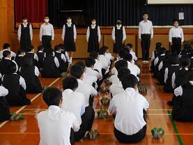 3学年は、①新旧学級プログラム委員による挨拶、②学級レクリエーション、③合唱練習でした。