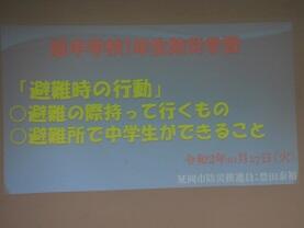 27日(火)、1年生の「総合的な学習の時間」に防災学習を行いました。延岡市の危機管理室の方々3名が講師として説明してくださいました。避難時の防寒着の工夫や、避難時は2泊するつもりで荷物を持っていくなど詳しい話を聞くことができました。
