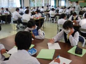 5日(木)、「2年生地域防災学習」を行いました。今回は、本校体育館が避難所になったことを想定し、各班で、避難者の立場に立って体育館をどう使うかを考え、「避難所マップ」を作成しました。各班の発表後、防災推進員より①発表の感想・マップの改善点②避難所運営のポイント・注意点・必要な物などの話がありました。