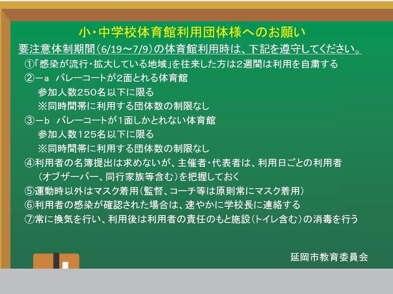 延岡市の方針として、警戒体制から要注意体制期間(6/19~7/9)に移行するのあたり、小中学校の体育館の夜間開放等の遵守事項を変更することになりました。