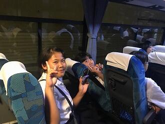 移動は陸路に移り、新門司港から黒崎駅前の安川電機ロボット工場へとバスは進みます。おや?バスに「にわか面」が!