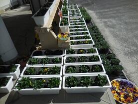 17日(水)、晴天ですが大変寒い真冬の天気でした。そんな中、玄関前には、卒業式や入学式の会場を豪華に飾ってくれる「パンジー」や「ビオラ」の準備がすすみ、春の訪れを予感させてくれます。昨日まで満開の花を咲かせていましたが、一ヶ月後の卒業式に向けて、技術員の有馬さんが花芽をすべて摘んで、その花を養液に入れて飾ってくださってます。大変きれいです。
