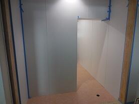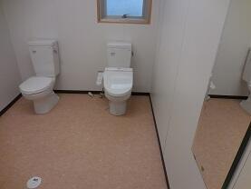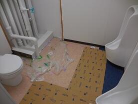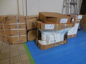 トイレの床材が張られ、人感センサーの照明が設置されました。便器等もたくさん搬入されています。工事業者さんも、いろいろな業種の方々がかかわっています。