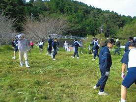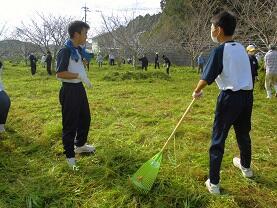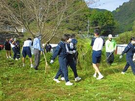 今回、康芝園グラウンドの西側を、午前7時から草刈り作業、午前8時から草集め作業の流れで、地域の方々と一緒に行いました。3年生49名、2年生31名、1年生15名の申し込みがあり、生徒たちのボランティア意識の高さを痛感しました。