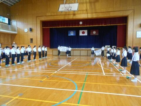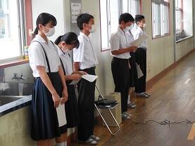 2年生は廊下から、各学級の中央委員会の紹介と各学級の良い点・改善点を話し、教室の生徒は真剣に耳を傾けていました。はじめは2・3年同時にマイクを使用したため音声がかぶるハプニングもありましたが、何とか乗り切りました。その後、全員で「挨拶の練習」を大きな声を出して行いました。