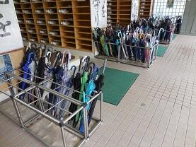 今朝のような時は、体育着登校を認めています。登校後、制服に着替えたり、靴下を履き替えたりできます。また制服が濡れた場合は、校内で体育着に着替えて過ごす生徒もいます。健康面から考えると、前日に天気を意識して各自準備をお願いします。傘の貸し出しもできますので、詳しくは本日配付の「生徒指導だより」をご覧下さい。