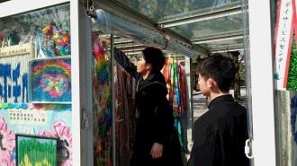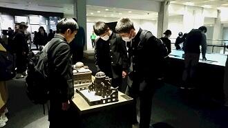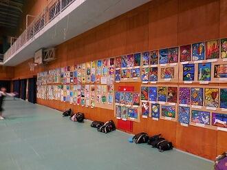 美術の作品も体育館に展示しました。中にはスマホで写真を撮っている保護者も。