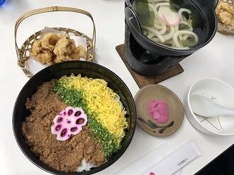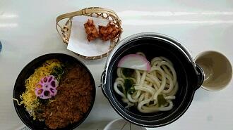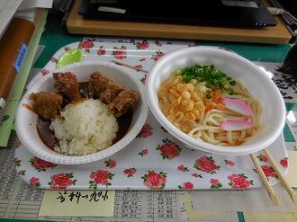昼食は、PTAによるバザー販売で各自食事をしました。写真は、ミニカレーにからあげ(別売)をトッピングしたものと、定番のうどんでした。結構おなかいっぱいに。