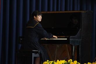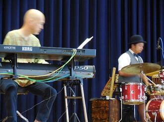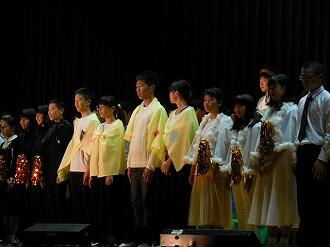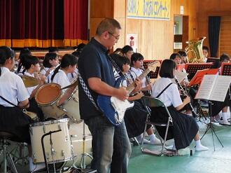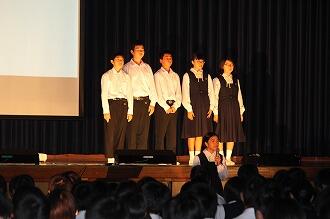 演奏の合間に、本校の職員も飛び入り参加。最初は照れ笑いでしたが、結構真剣な面持ちとなり、その歌声とパフォーマンスに生徒も大喜びでした。