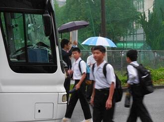 今朝のような時は、体育着登校を認めています。登校後、制服に着替えたり、靴下を履き替えたりできます。また制服が濡れた場合は、校内で体育着に着替えて過ごす生徒もいます。健康面から考えると、前日に天気を意識して各自準備をお願いします。傘の貸し出しもできますので、詳しくは本日配付の「生徒指導だより」をご覧下さい。